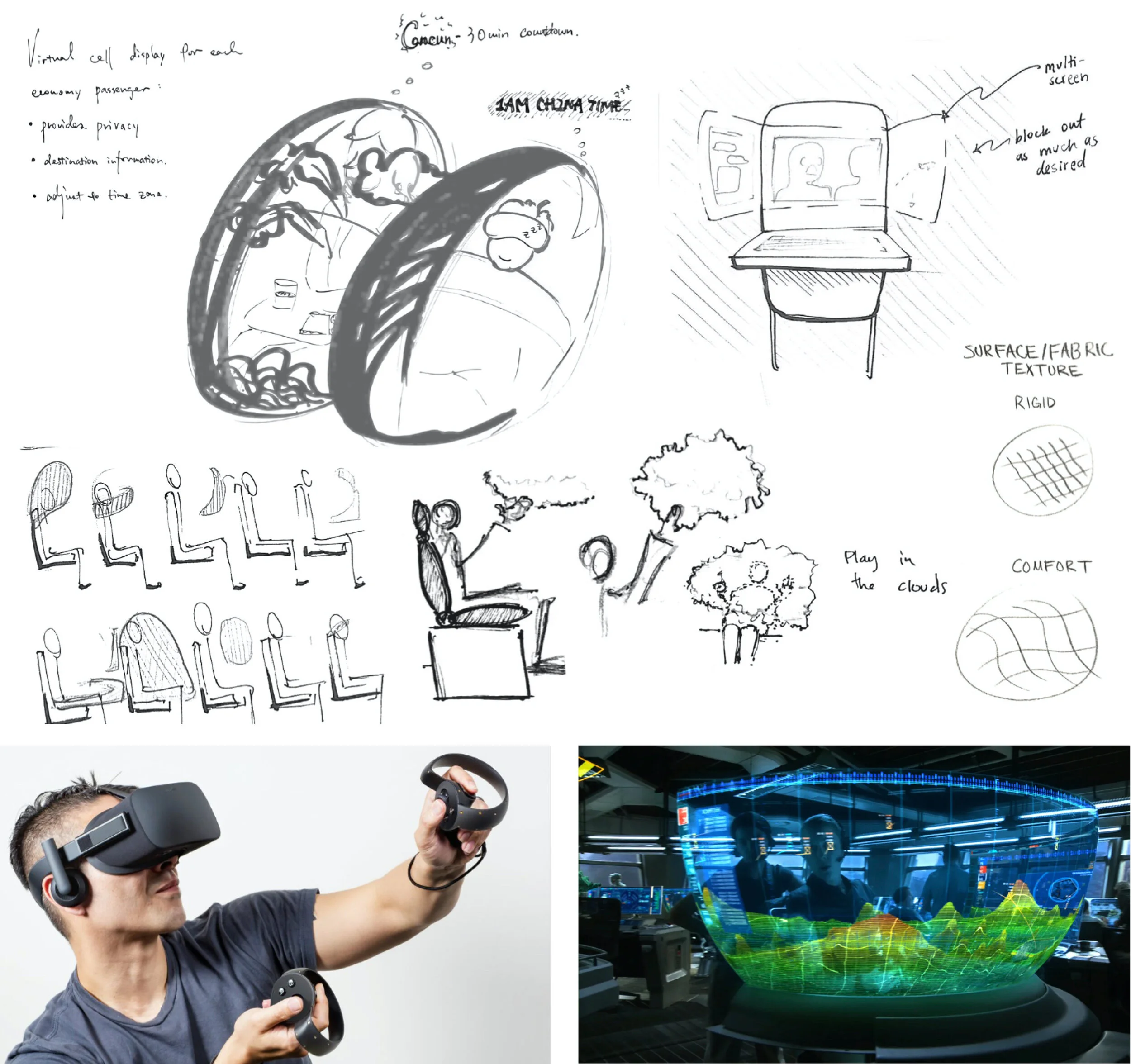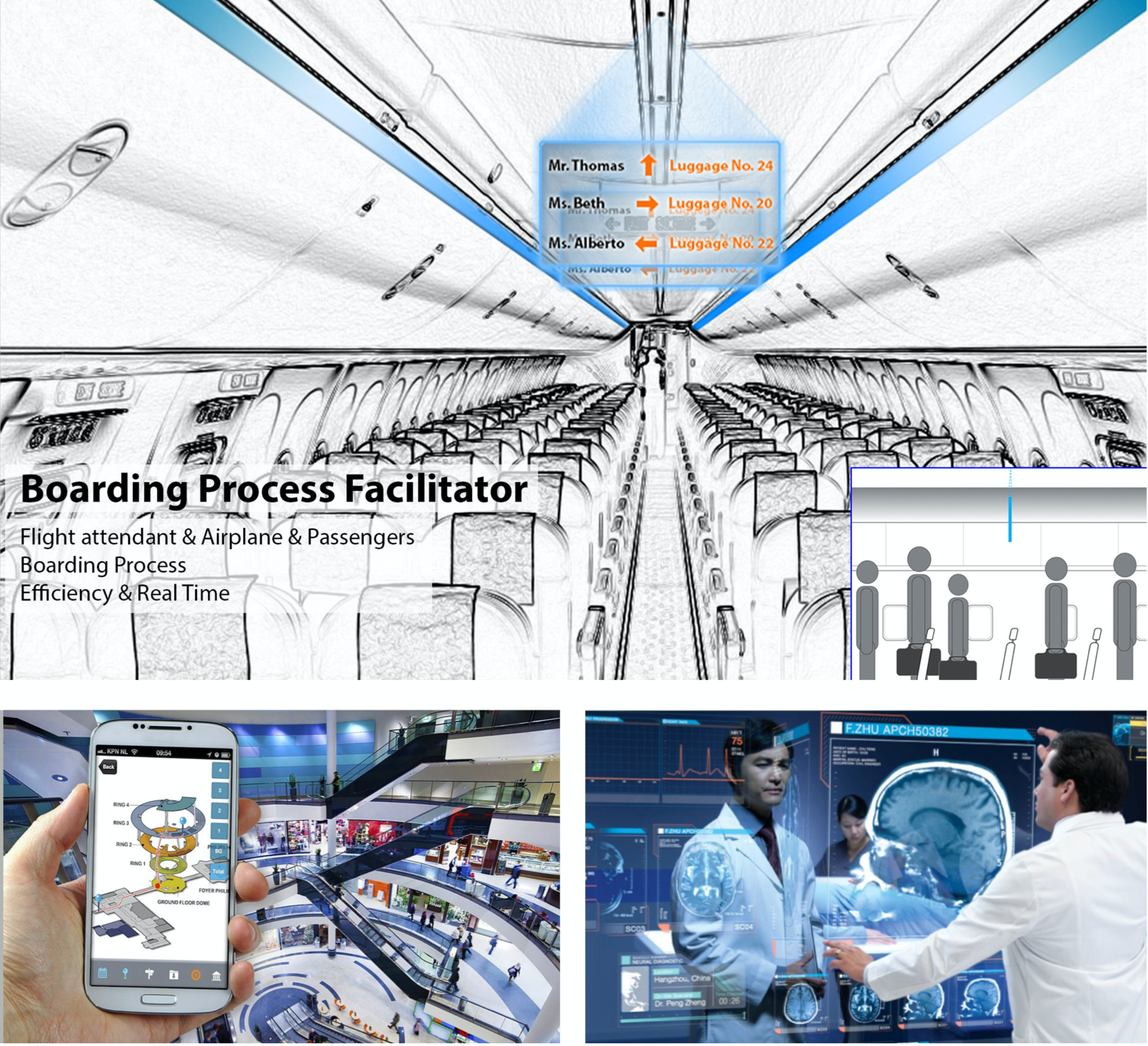 University of Cincinnati innovation center (Livewell Collaborative) collaborated with Boeing to visualize the use of cabin surfaces as communication displays for both the crew and passengers during the entire flight experience: from boarding to arriving at their final destination. We used principles of adaptable design and state of the art technologies, designing future on flight communication to provide new experiences and generate auxiliary income for the airline. Project focused on possibilities generated by Virtual Reality and Holographic Technologies.