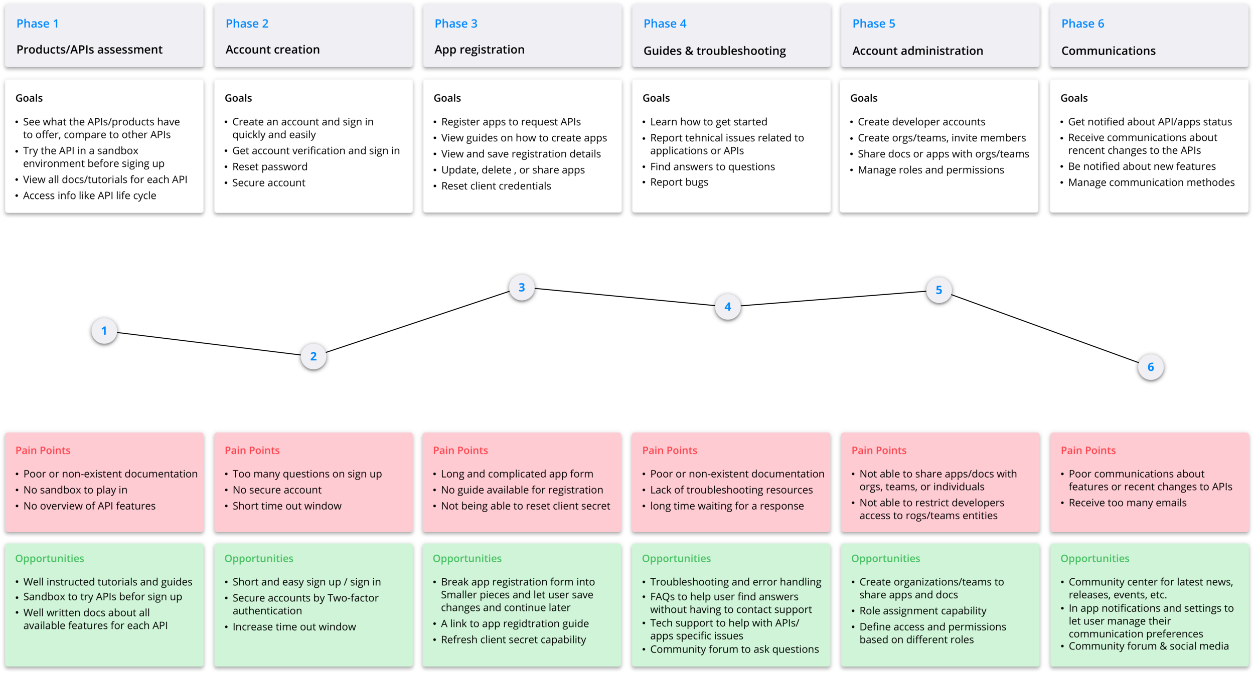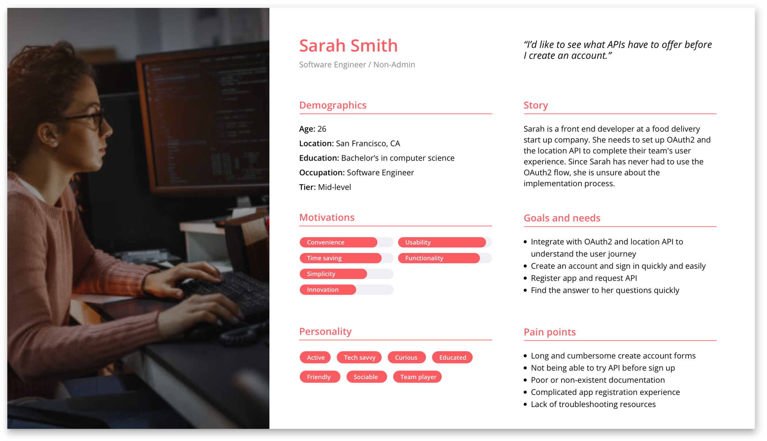 Identified two primary user groups for the API portal: software engineers (web/mobile developers) and admin users. Developed detailed personas to represent each group, capturing their distinct needs, pain points, and usage patterns. These personas served as cornerstone reference points throughout the design process.